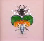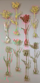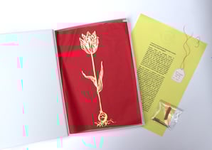 tulp gelegd tussen rood vloeipapier, beschrijving tulpenmanie, prijskaartje, zakje met speld-dunne spijkertjes.