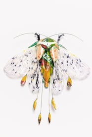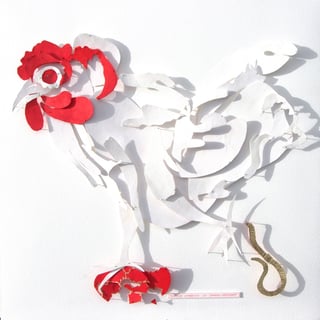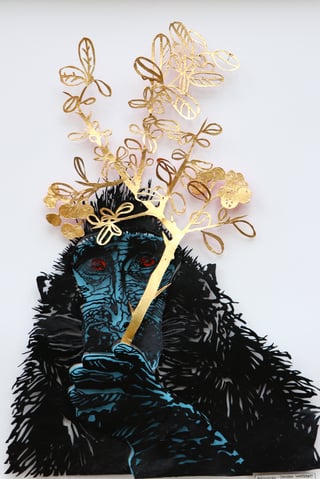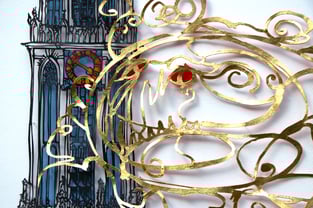 Voor de expositie 'Utrechtse stadknippers' maakte ik speciaal een Domtoren. Geen saaie, maar een exemplaar dat omver wordt gelazen door een gouden windmonster. Net zoals in het jaar 1674. Een deel van de kerk stortte destijds in. Die wind kreeg de naam 't Schickelijk tempeest. Zo ook dit werk.