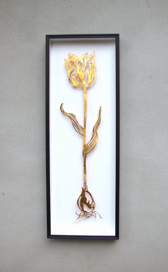 Anders dan de kleinere tulpen, is deze groter variant voorzien van imitatie bladgoud.